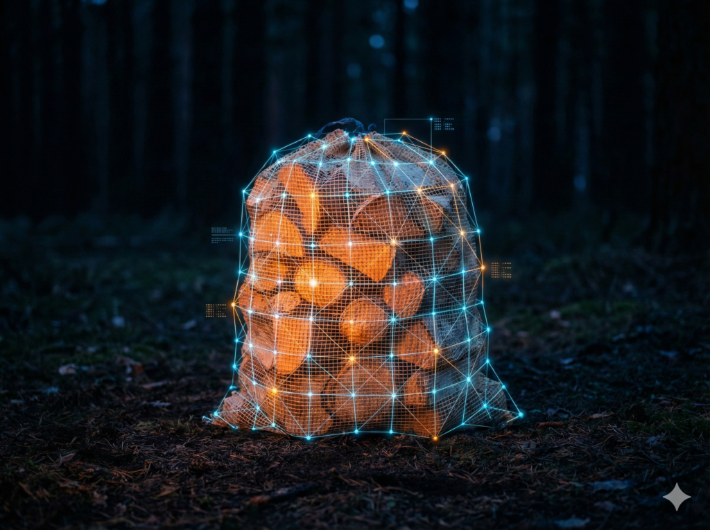 Kluven blandved 25-30cm av både barr- och lövträd förpackad i 60L nätsäck. Redo att eldas.